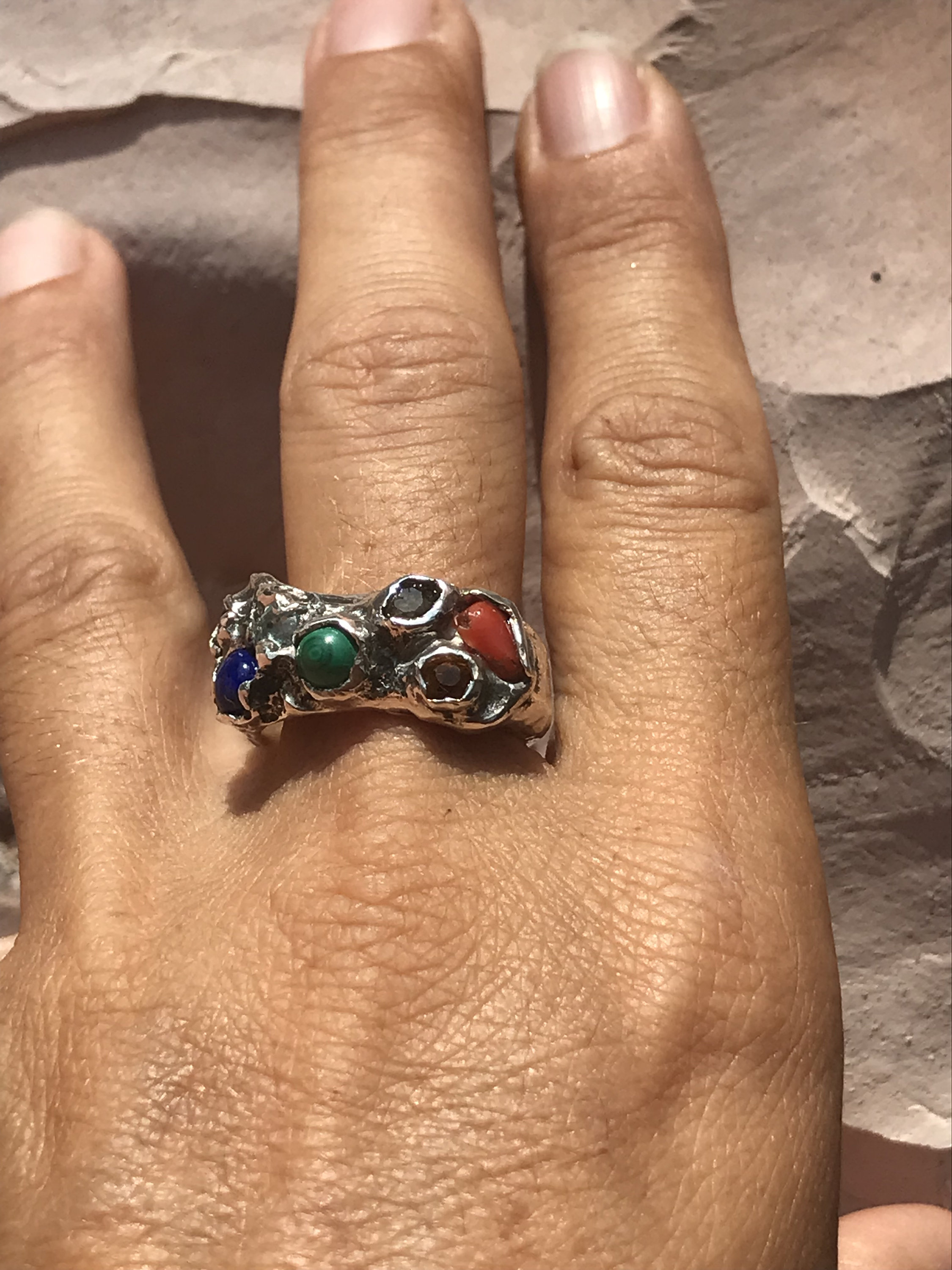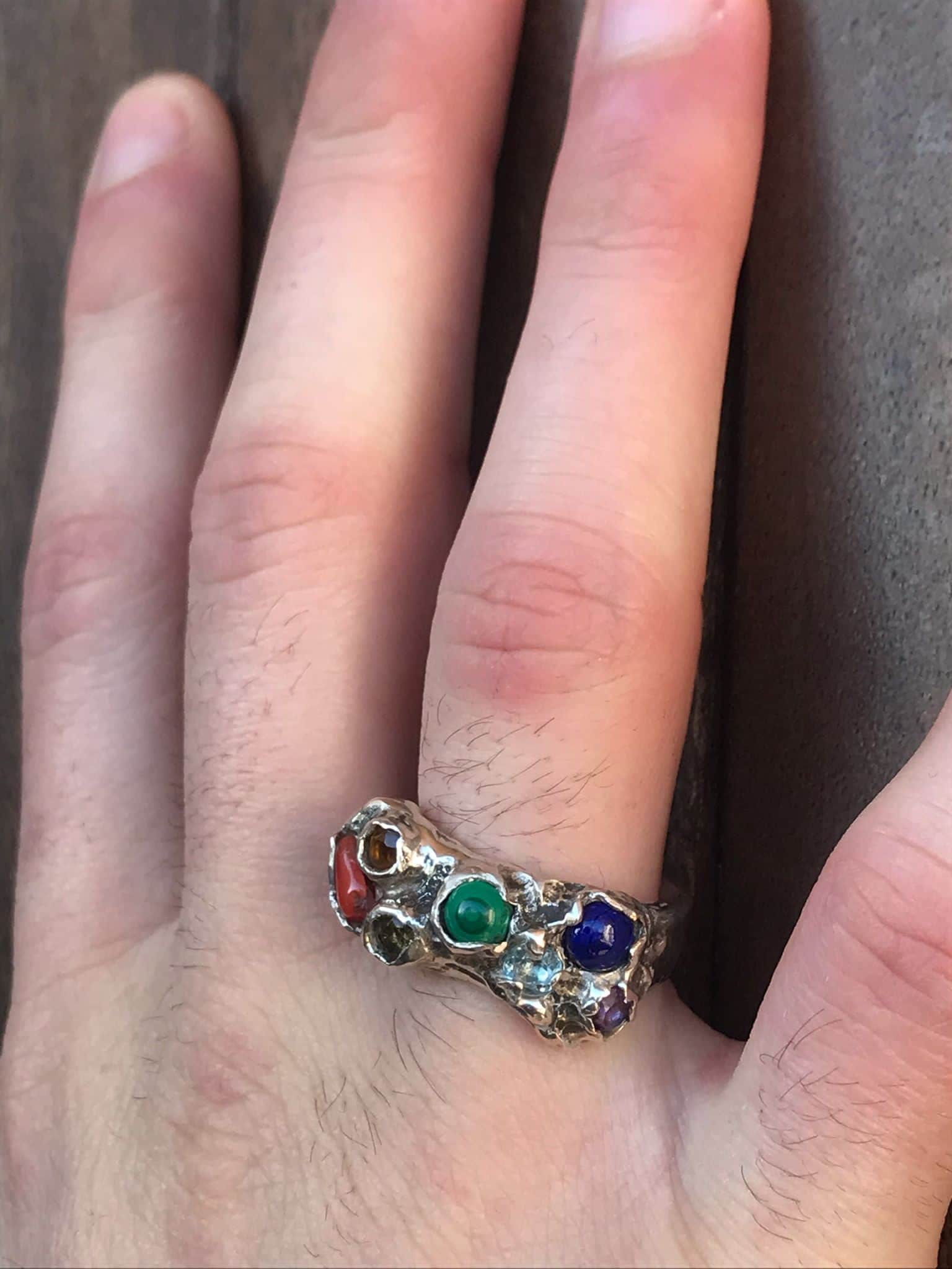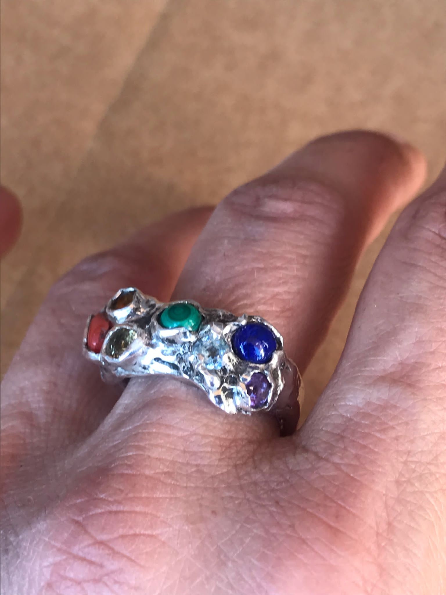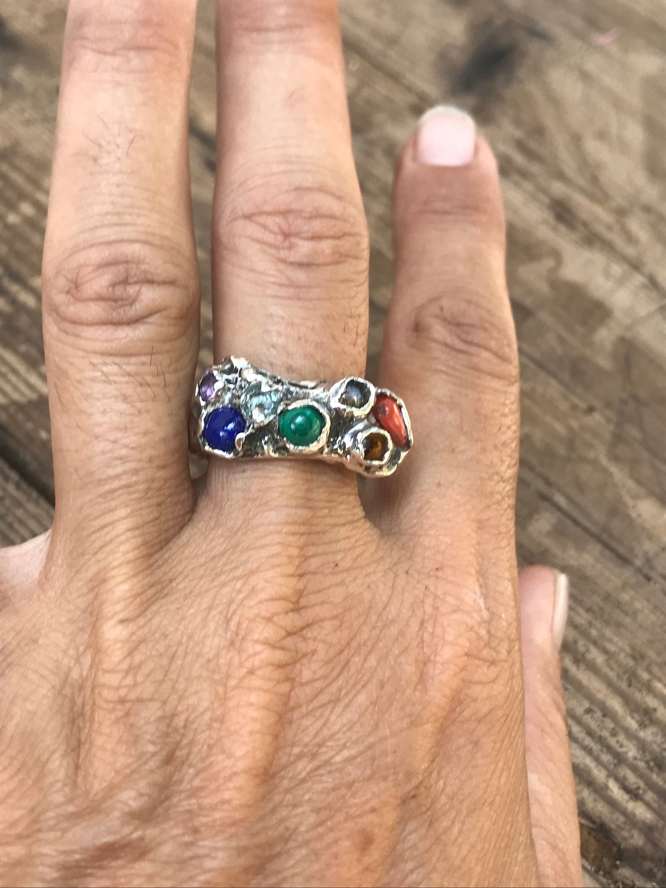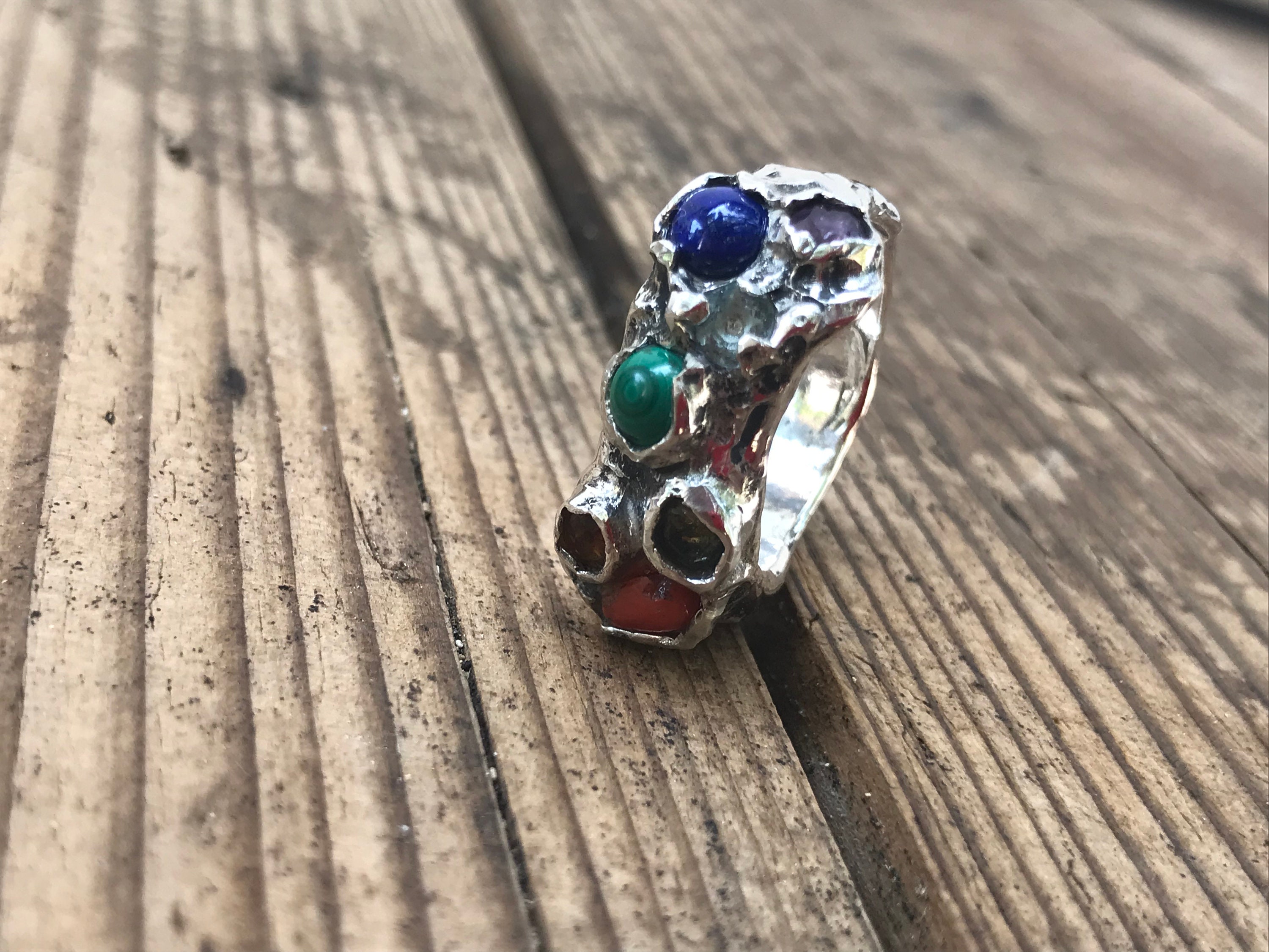 Anello argento con ametista, citrino, corallo malachite, acqua marina, lapis, peridoto